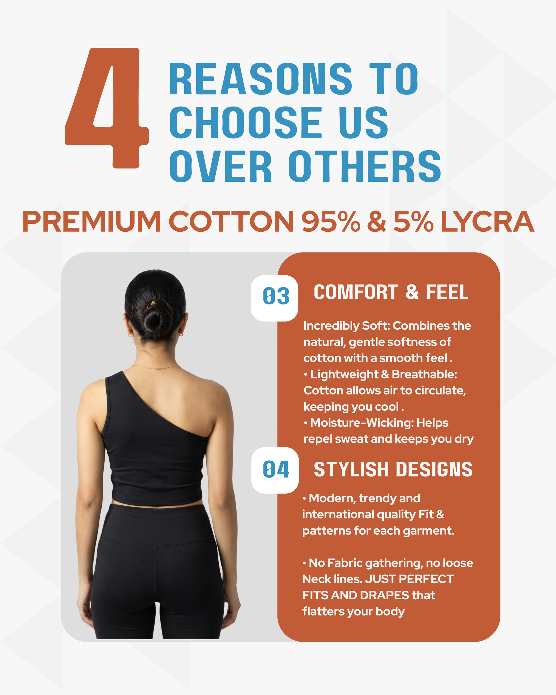 • Modern, trendy and international quality Fit & patterns for each garment. • No Fabric gathering, no loose Neck lines. JUST PERFECT FITS AND DRAPES that flatters your body |