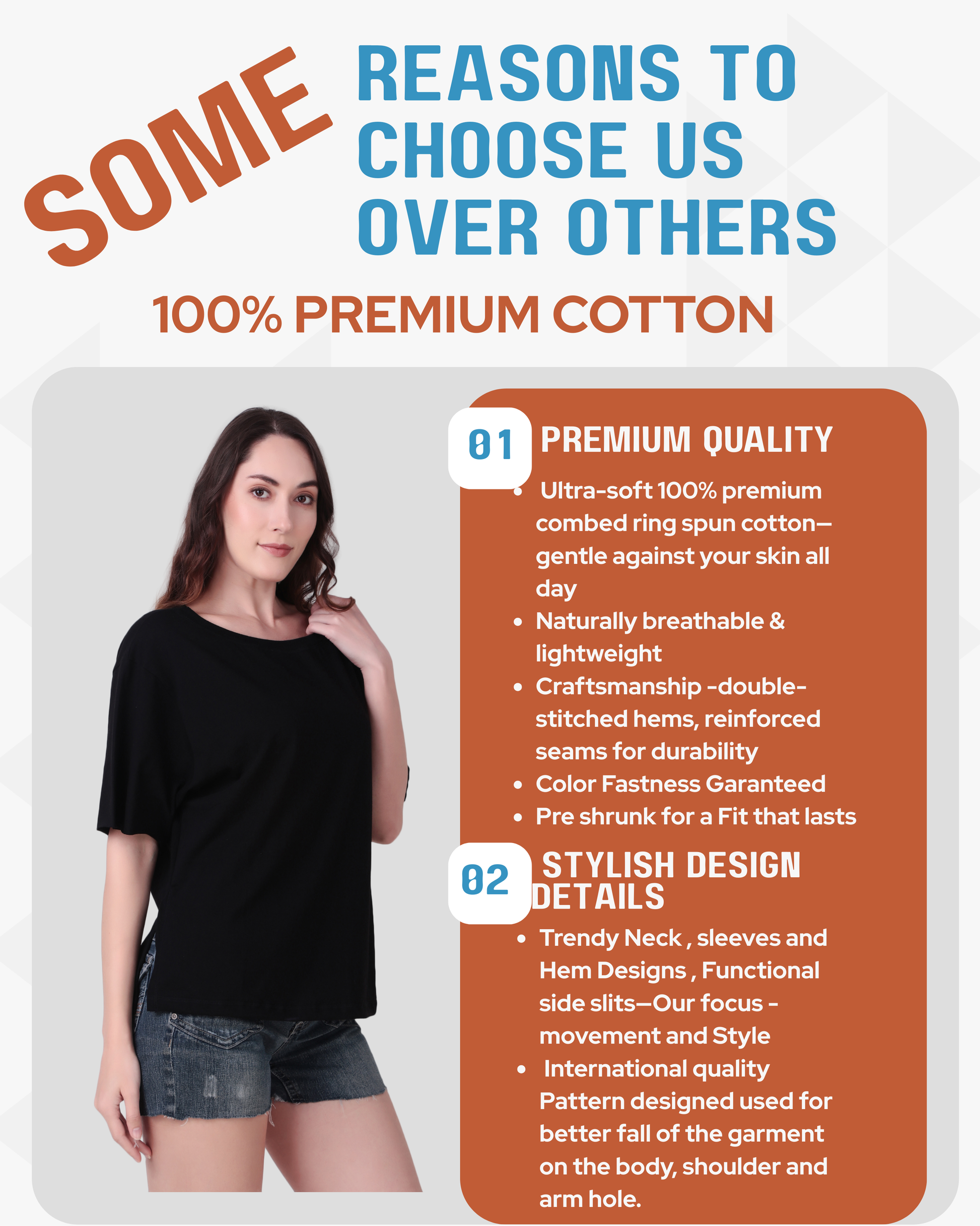 Ultra-soft 100% premium combed ring spun cotton—gentle against your skin all day Naturally breathable & lightweight Craftsmanship -double-stitched hems, reinforced seams for durability Color Fastness Garanteed Pre shrunk for a Fit that lasts |